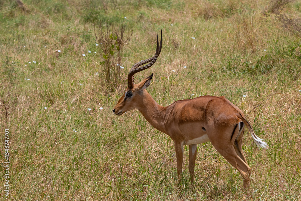 Impala - Aepyceros melampus, mała, szybka antylopa z afrykańskiej sawanny, Samiec z pięknym porożem, Park Narodowy Tsavo i rezerwat wzgórz Taita, Kenia, Afryka