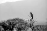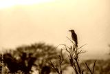 Kraska (Coracias garrulus) siedzący na czubku suchego krzewu, na mały kolorowy ptak zamieszkujący tereny sawanny, Park Narodowy Tsavo i rezerwat wzgórz Taita, Kenia, Afryka