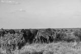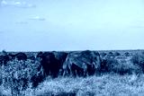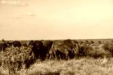 Słoń afrykański (Loxodonta africana), rodzina posilająca się miedzy krzewami na sawannie