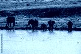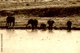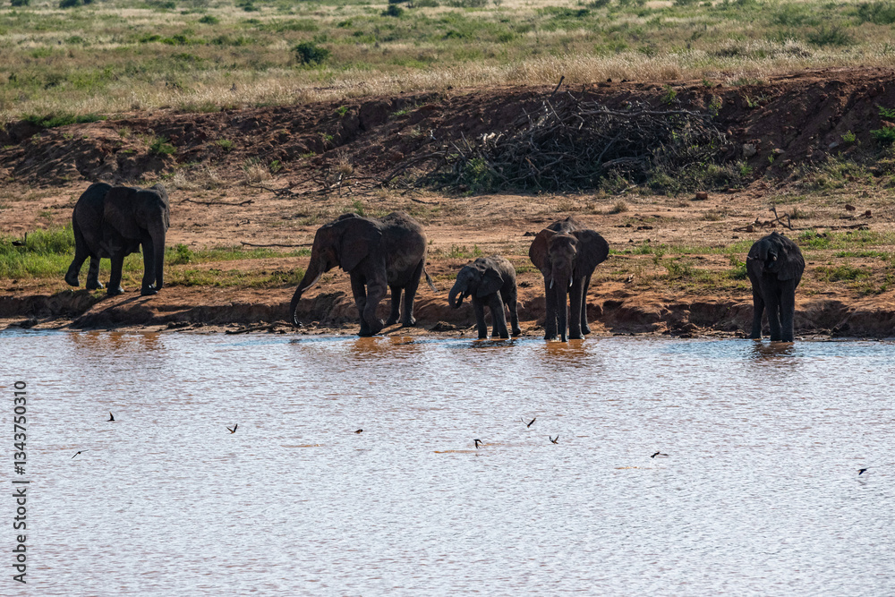 Słoń afrykański (Loxodonta africana), rodzina z młodymi przy wodopoju na sawannie w Park Narodowy Tsavo East, Kenia, Afryka