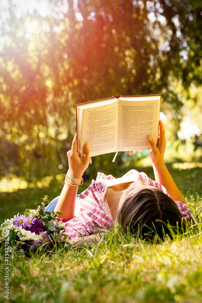 Young woman reading a book in the park with flowers