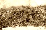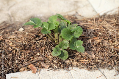 Strawberries without young berries growing in the garden under the mulch.