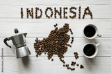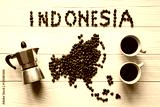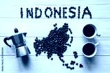 Map of the Indonesia made of roasted coffee beans laying on white wooden textured background with two cups of coffee and coffee maker