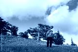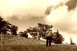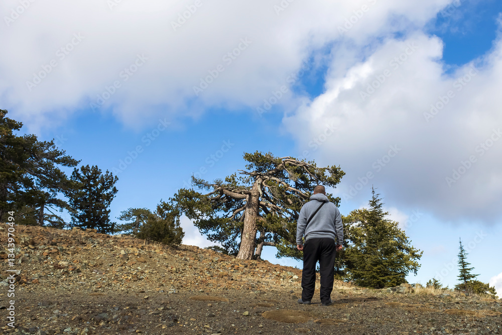 Man stands on mountain slope in back to camera pose, Troodos, Cyprus