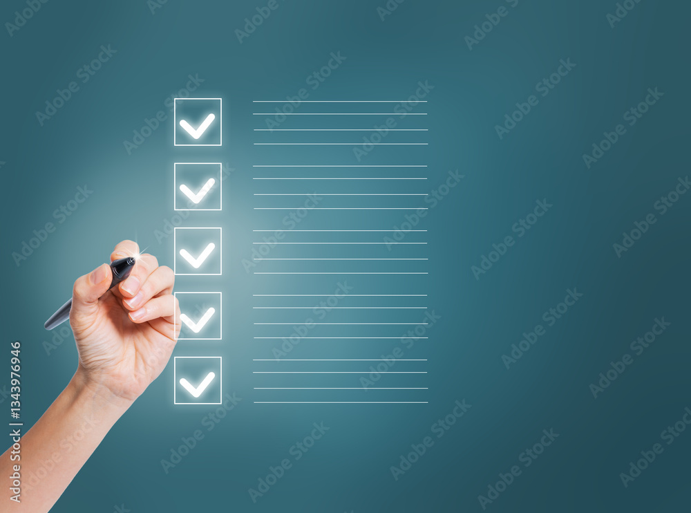 Female hand with pen choosing several options from five offered. Checklist concept, checking boxes.