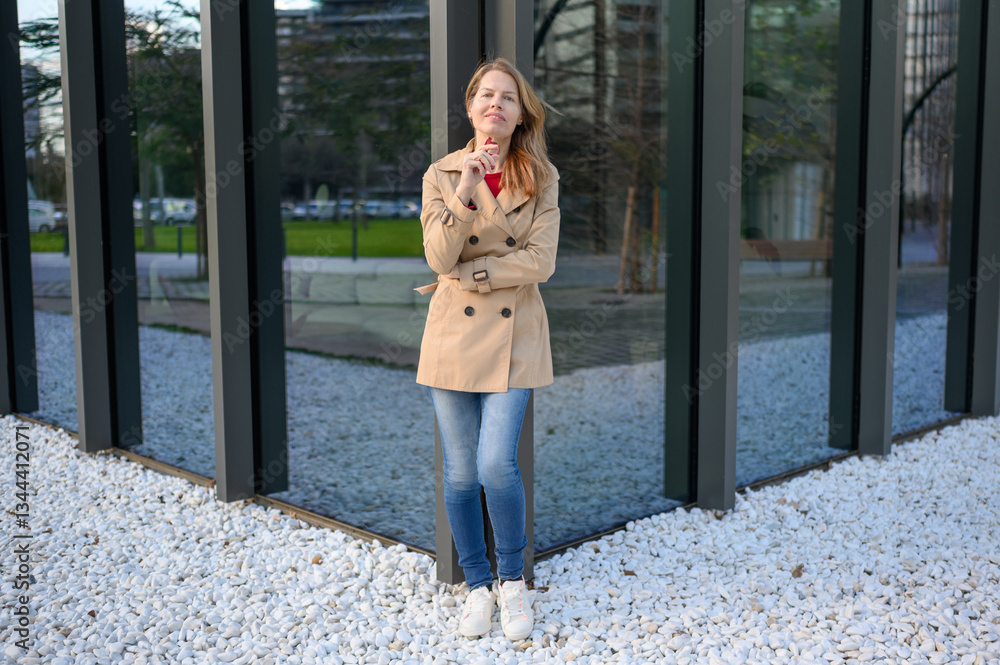 Businesswoman leaning against modern building in the city