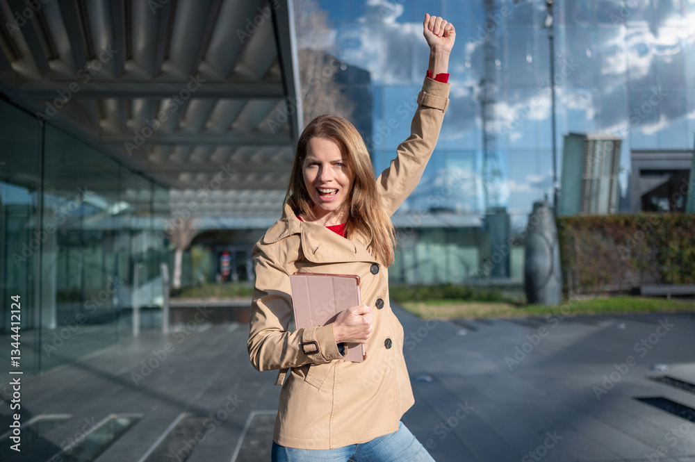 Happy businesswoman celebrating success with tablet and raised fist outdoors