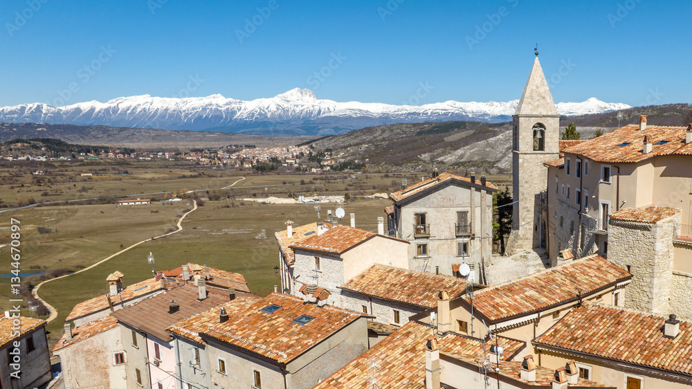 Aerial view of Rocca di Mezzo, a small village on a hill in the province of L'Aquila in Abruzzo, Italy. In the background is the snow-capped Gran Sasso mountain range.