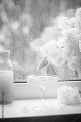 Fresh pink non alcoholic cocktail in glass with lilac flowers against window background.