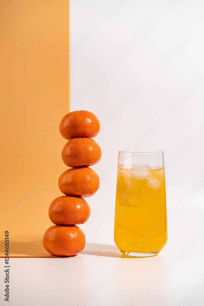 refreshing tangerine drink with ice in a glasse on white and orange background with fresh tangerine stack. Minimalism and balance concept.