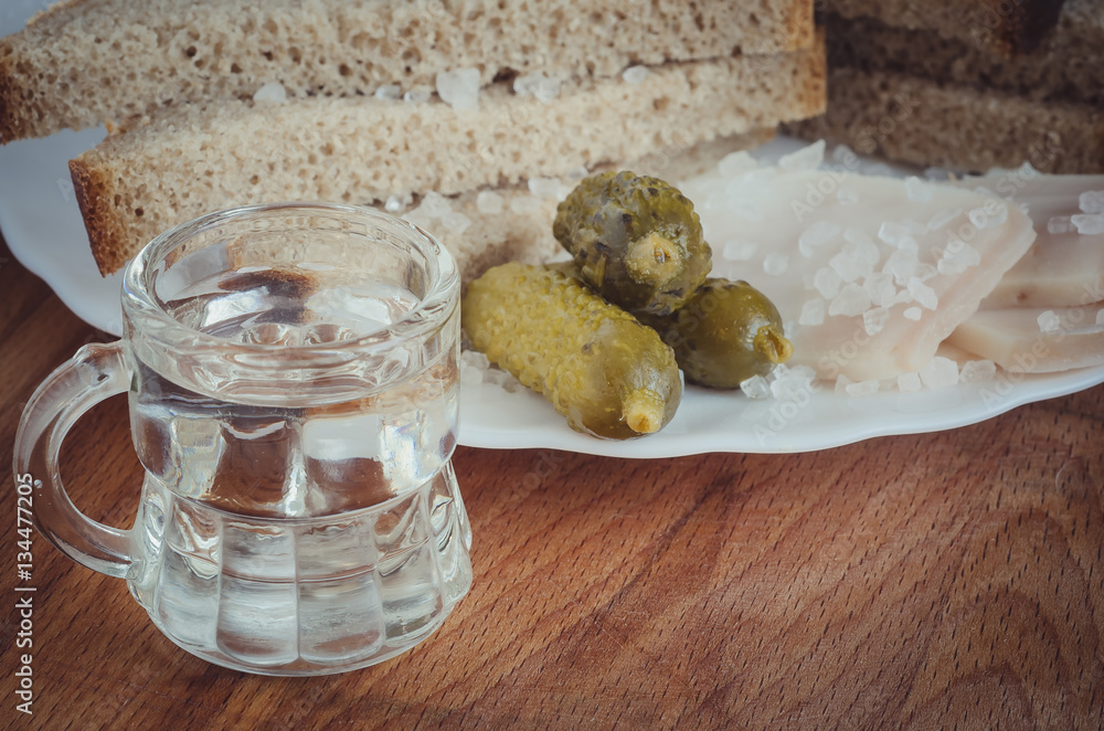 Salted cucumbers, bacon, bread . Classic Russian appetizer.