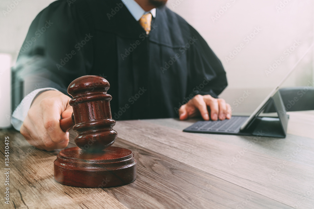 justice and law concept.Male judge in a courtroom striking the gavel,working with digital tablet computer docking keyboard on wood table,filter effect