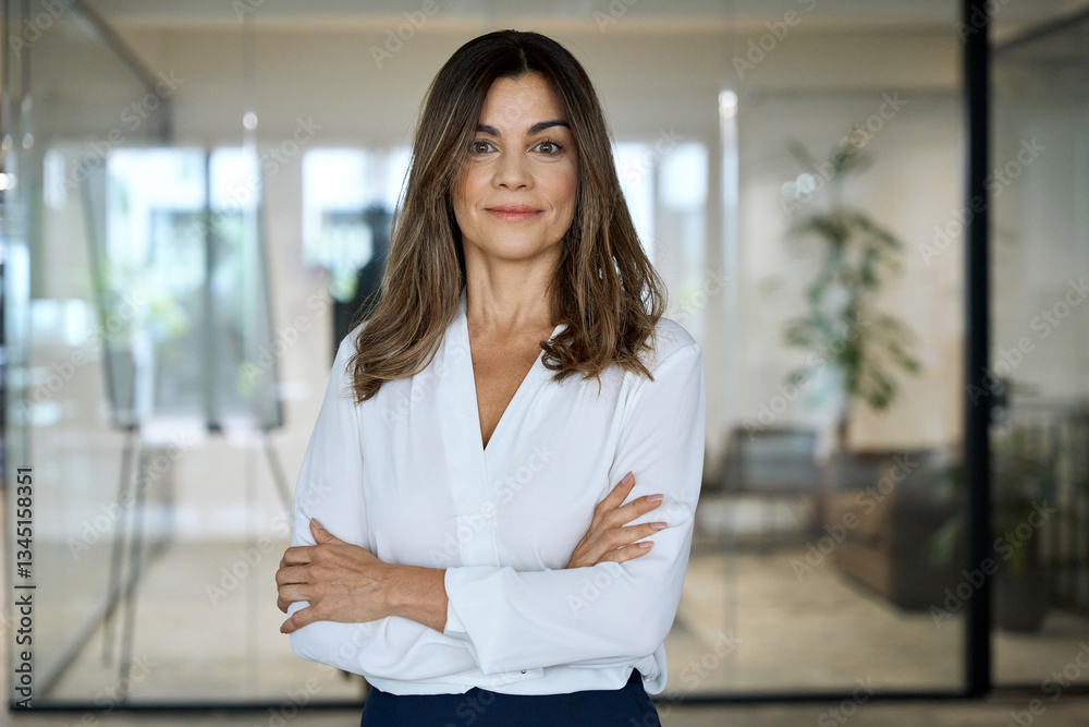 Smiling confident 45 years old professional middle aged business woman corporate leader, happy mature female executive, older lady manager standing in office arms crossed looking at camera, portrait.