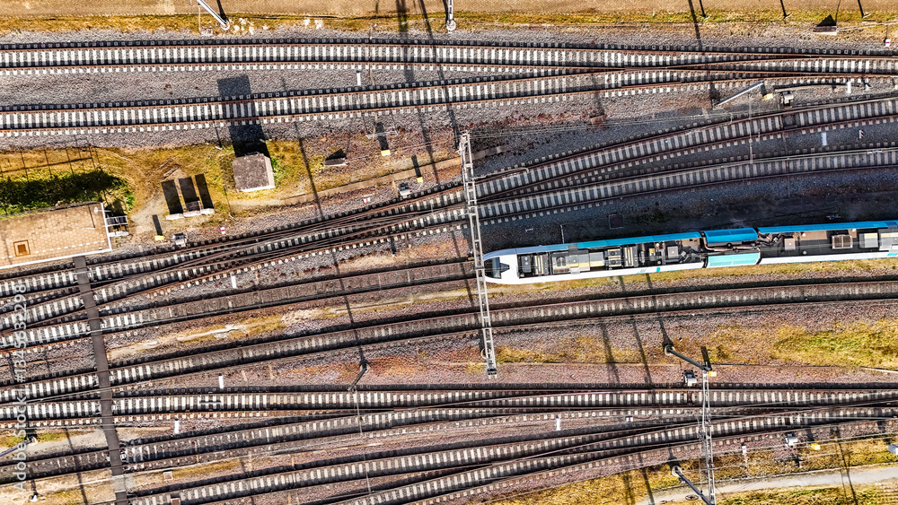 Railroad, train tracks and train aerial drone view from above, railway station in the Netherlands, transportation and public transport infrastructure concept