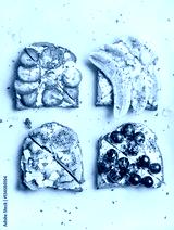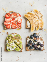Healthy breakfast toasts. Wholegrain bread slices with cream cheese, various fruit, seeds and nuts. Top view, grey marble background. Clean eating, vegetarian, dieting concept