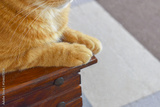 Ginger cat sitting on a table. Close up of cat paw. Happy pet relaxing at home.