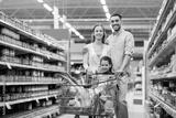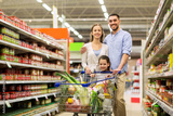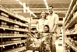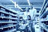 family with food in shopping cart at grocery store