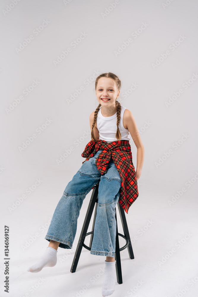 Full length vertical portrait of joyful preteen girl with braids, wearing jeans and plaid shirt tied around waist, sitting on stool, laughing heartily on white isolated background, looking at camera