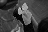 close up of Asian woman with large white bow in her hair, gently held by another person, creating tender and caring moment