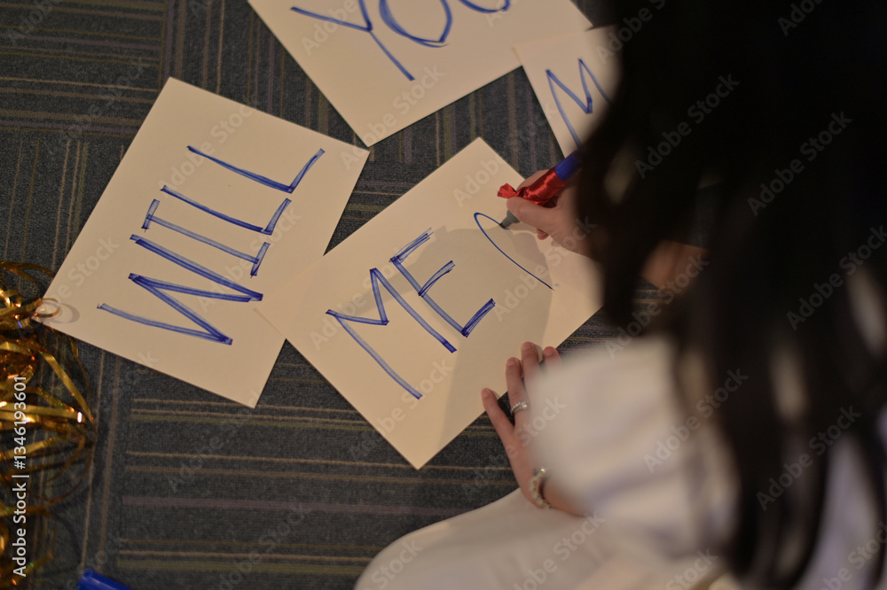 person writing heartfelt message on paper with blue marker, surrounded by other handwritten notes on carpeted floor