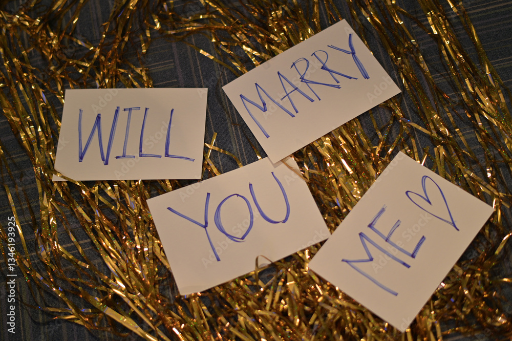 Proposal message Will you marry me written on white cards with blue text, placed on golden tinsel background, creating romantic atmosphere