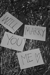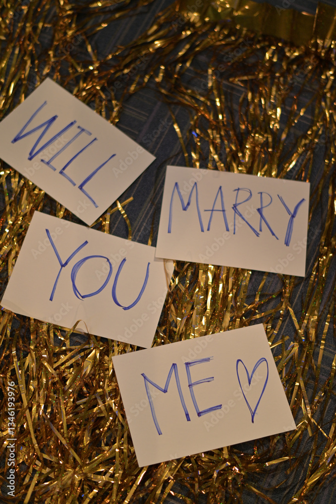 Proposal cards with Will You Marry Me written on them, placed on golden tinsel background, creating romantic and celebratory atmosphere