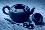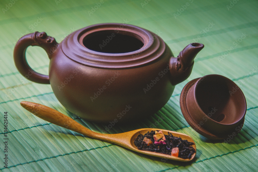 Close-up ceramic teapot, aromatic dry tea with fruits and petals in wooden spoon on green bamboo background. Selective focus.
