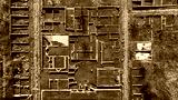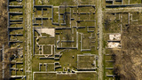 Aerial perpendicular view of the ruins of an ancient Roman city in the archaeological area of Alba Fucens, in the municipality of Massa d'Albe, in the province of L'Aquila, Abruzzo, Italy.