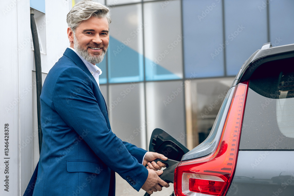 Man in suit refueling his vehicle at station with unleaded petrol holding the nozzle
