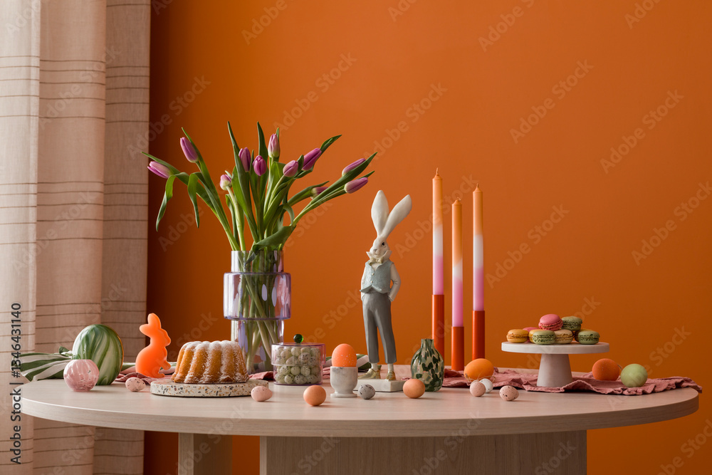 Close-up of an Easter table with a whimsical rabbit figurine, ombre candles, and delicate pastel-colored eggs.