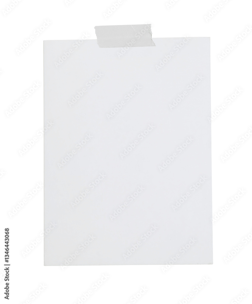 Empty note paper mockup. Message reminder, greeting card invitation template isolated on transparent background. White paper texture. Grunge ripped grey adhesive washi tape. Business office stationery