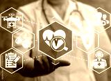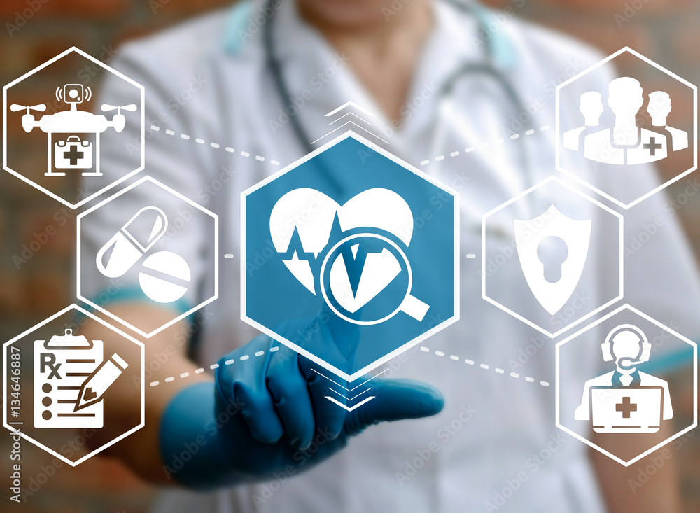 Medicine, assurance, healthcare concept - doctor presses icon hands holds heart with pulse. Health service and support. Nurse touched tablet sign. Medical, assistance, treatment, wellness, insurance