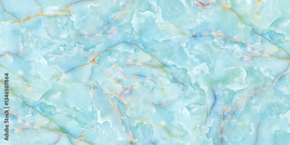 Cyan-blue colored onyx marble texture background, natural stone design for ceramic tiles, colorful veining pattern, smooth Tiffany blue-colored crystal surface, and cloud texture.