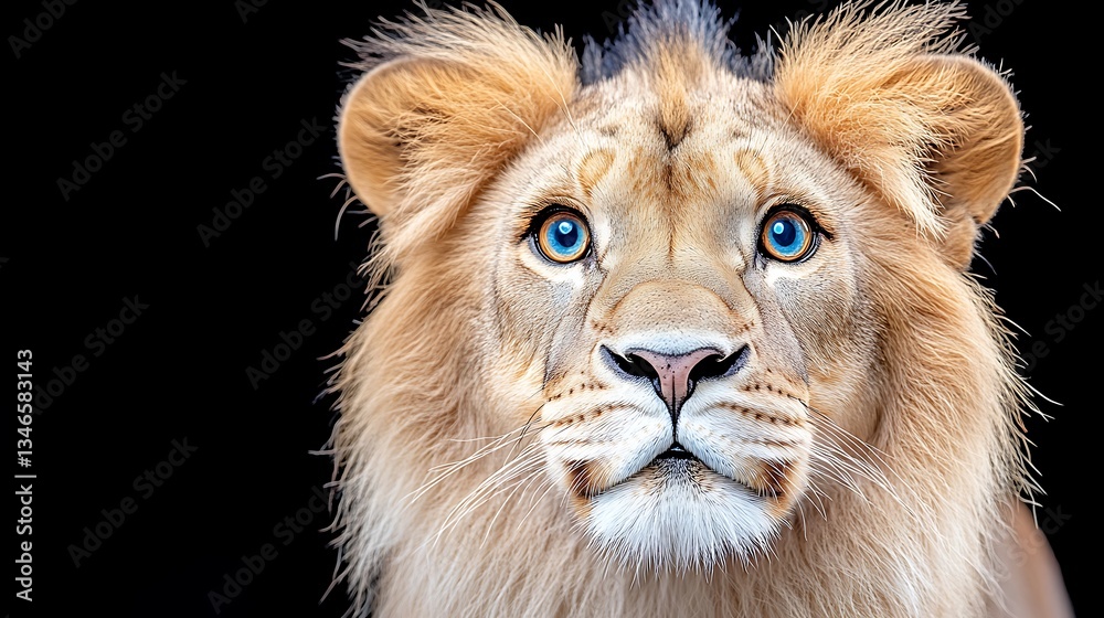 Majestic Young Lion with Striking Blue Eyes Close Up Portrait against Black Background