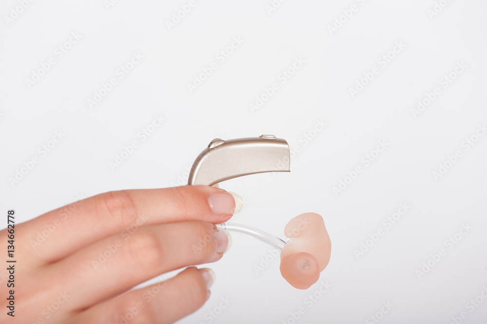 A woman's hand holding a digital hearing aid
