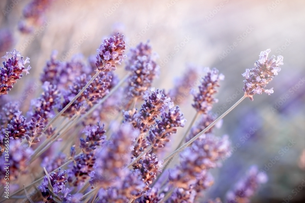 Soft focus on lavender flowers in flower garden behind my home, lavender flowers lit by sun rays