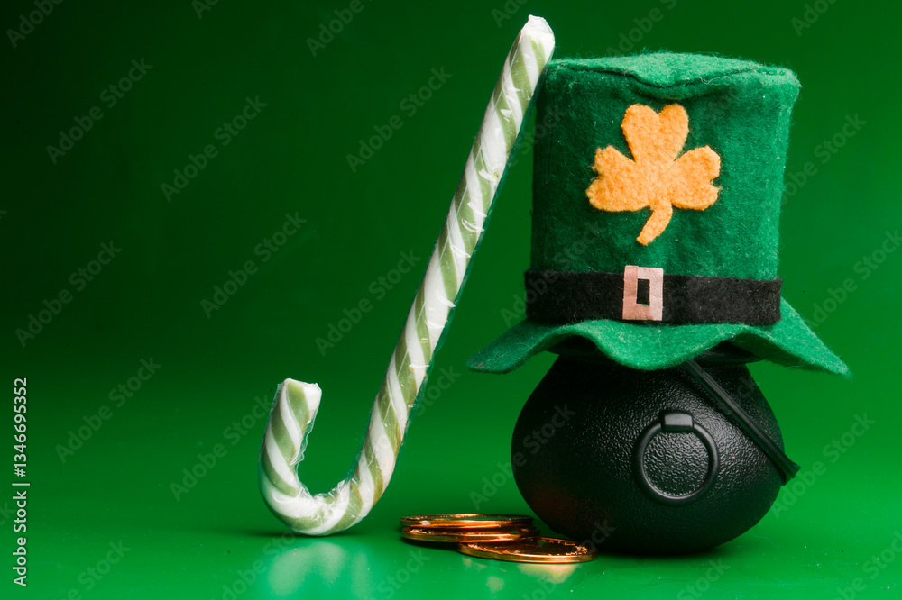set of symbols of st. patrick's day. Bucket with money, leprechaun hat and candy cane