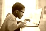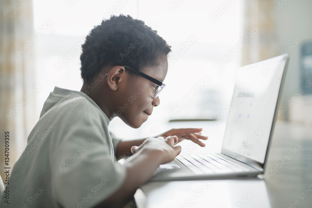 Little American boy studying online with laptop in kitchen