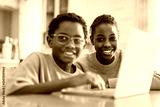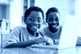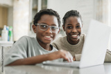 Little American boy studying online with laptop in kitchen with sister