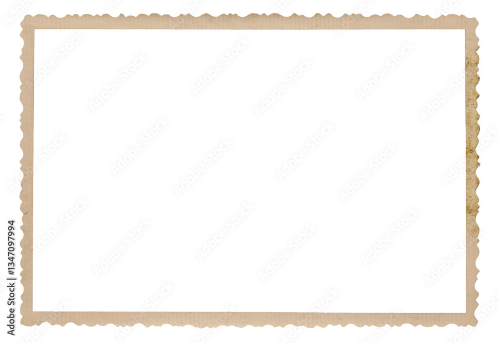 Vintage photo paper frame with scalloped edge and dust and splatters isolated on transparent background. Scanned material for retro photo frames and templates