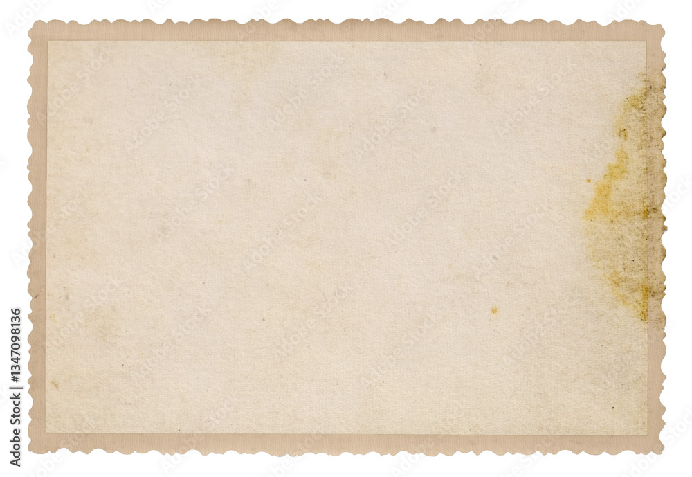 Vintage scalloped edge photo paper with dust, creases, and splatters on transparent background (png image). Useful for design, vintage effects, and backgrounds.