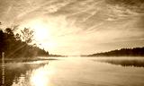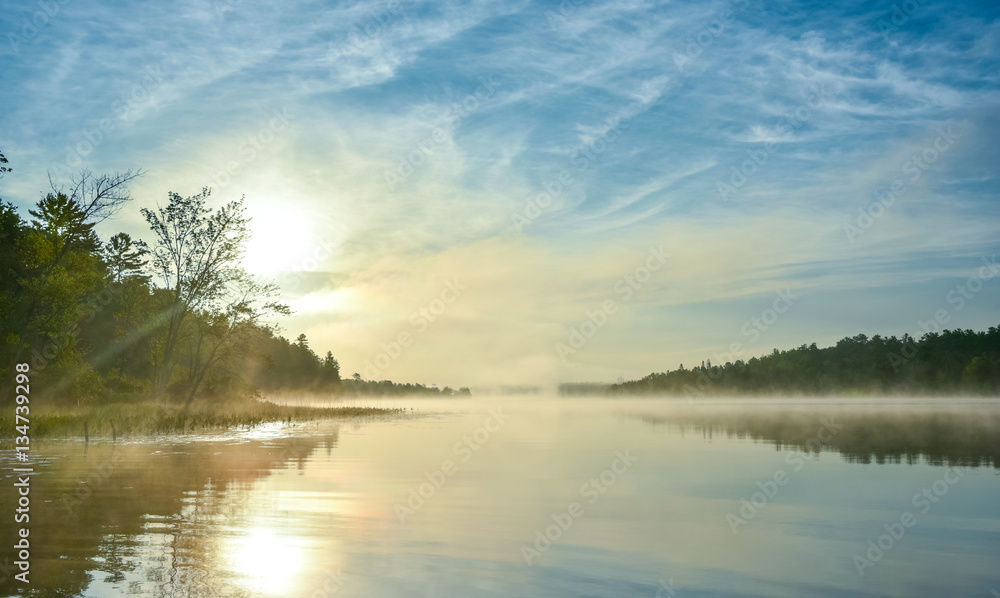 Brilliant and bright mid-summer sunrise on a lake. Warm water and cooler air at daybreak creates misty fog patches. Still water along a calm, quiet Ontario lakeside.