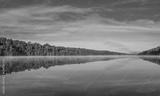 Bright mid-summer blue sky, misty morning in the middle of Corry lake. Warm water and cooler air at daybreak creates misty patches along shoreline. Still water along a calm, quiet lakeside.