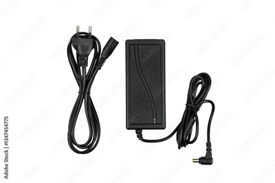 A black power adapter with two cables, one ending in a plug for an outlet and the other in a connector for a device, isolated on a white background.