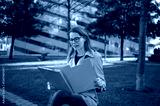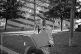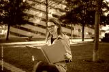 Woman reading documents in urban park setting