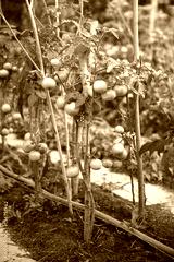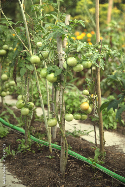 Green tomatoes growing in the open field on a bed covered with mulch of dry tavy. Future harvest in their own country.