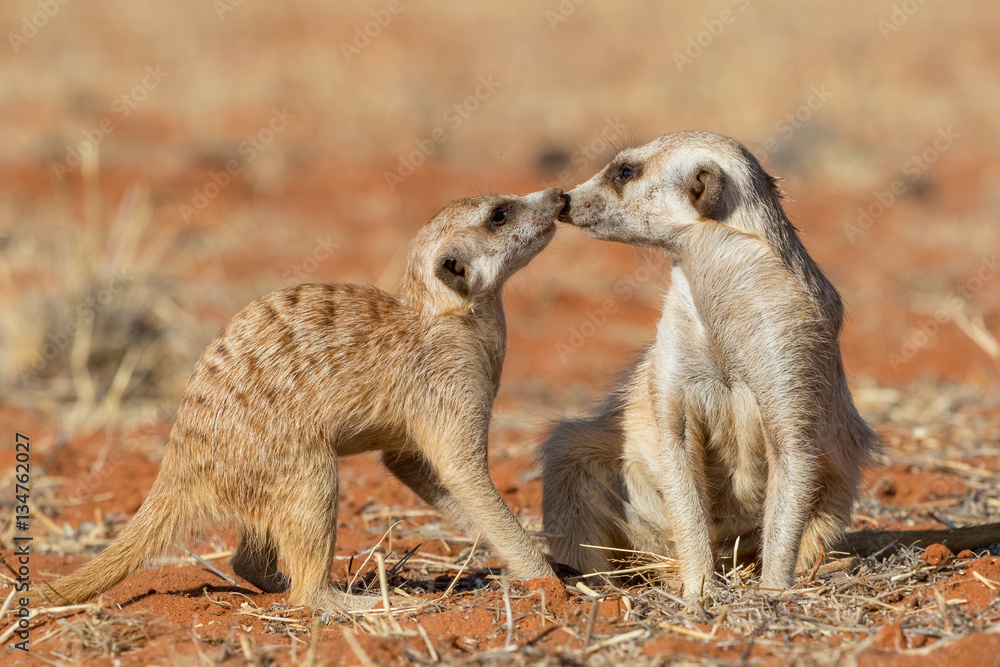 Meerkats couple playing on the sand (Suricata suricatta), Kalahari desert, Namibia