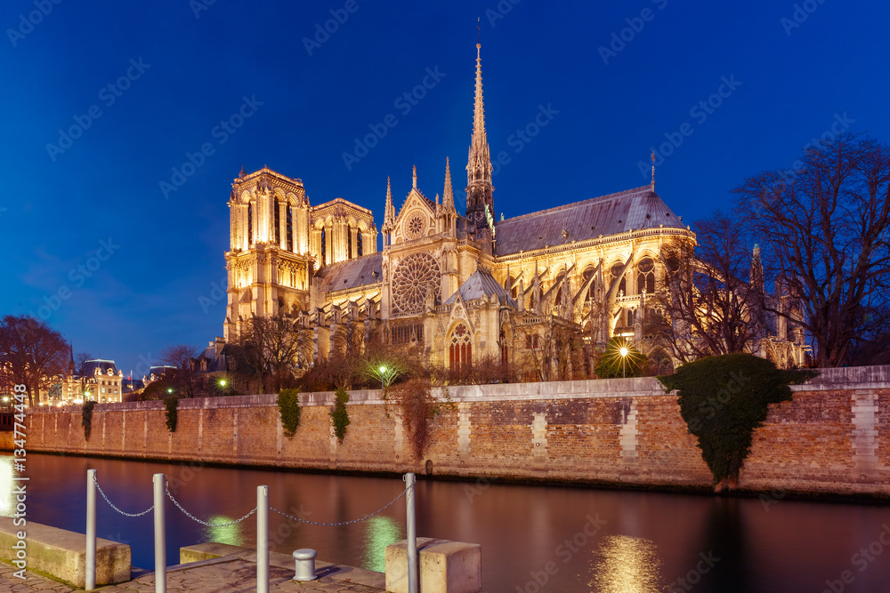 Cathedral of Notre Dame de Paris during evening blue hour, France