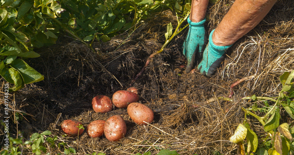 CLOSE UP: Gardener wearing gloves during a bountiful harvest of potatoes grown in straw. Digging and picking piles of healthy tubers as a result of organic and ecological farming in small garden.