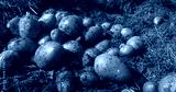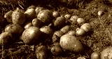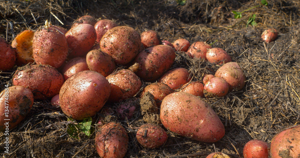 CLOSE UP: Bountiful harvest of red potatoes from a home vegetable garden. Pile of handpicked tubers lies on dark, rich soil. Homegrown potatoes as a rewarding result of organic and sustainable farming